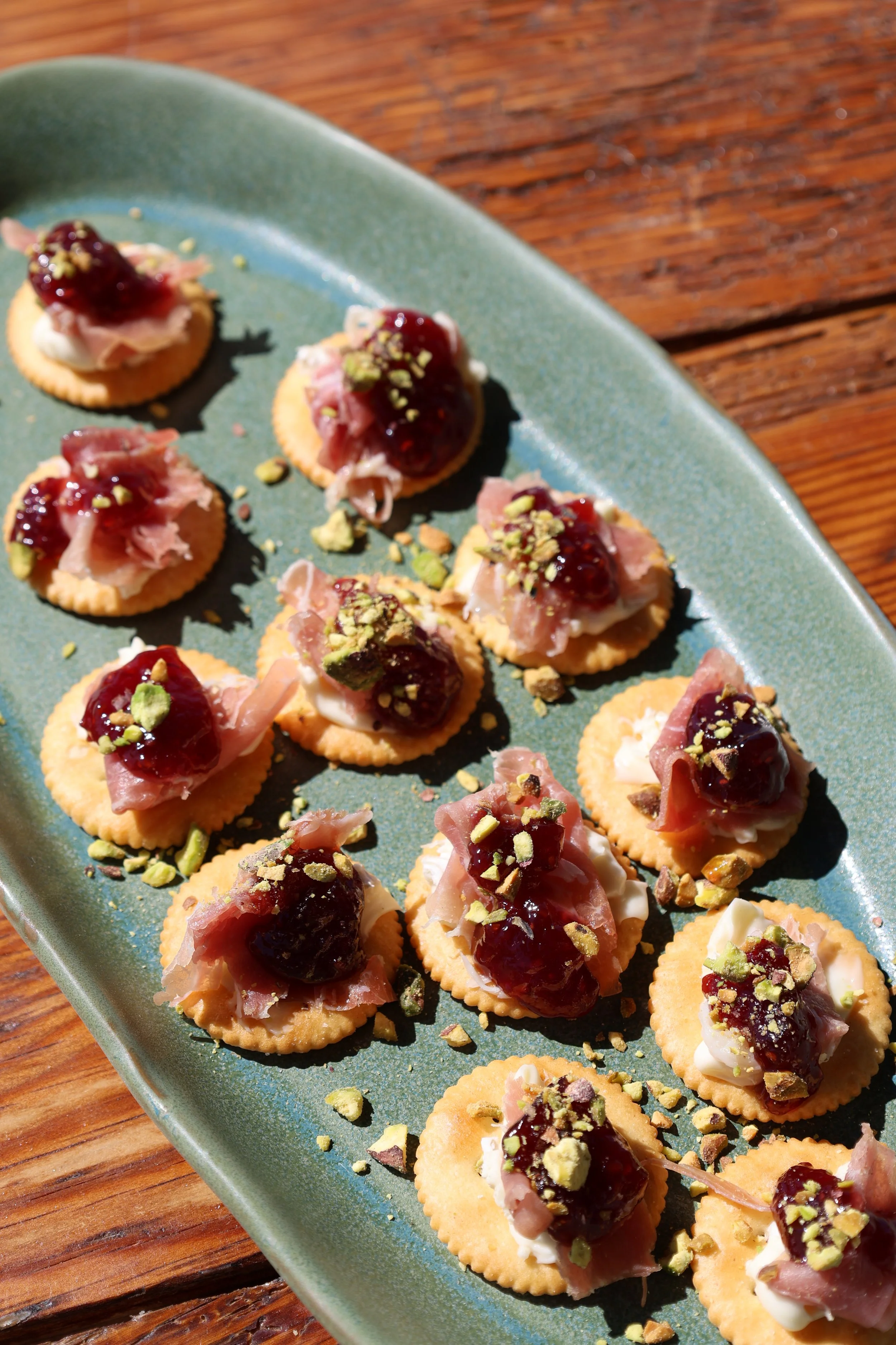 Spread a small amount of brie onto each cracker. Tear a piece of prosciutto and place it on top.Finish & serve